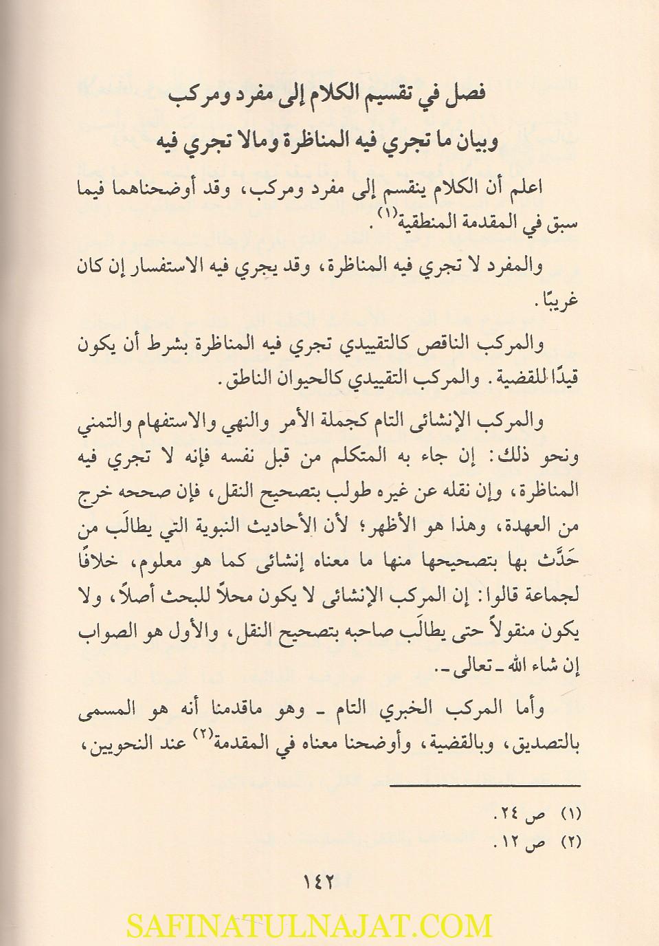 فصل في تقسيم الكلام إلى مفرد ومركب وبيان ما تجري فيه المناظرة وما لا تجري فيه. فصل في التقسيم. فصل في شروط صحة التقسيم. فصل في بيان أوجه الاعتراض على التقسيم وبيان طرفي المناظرة في التقسيم. فصل في الأجوبة عن الاعتراضات الموجهة إلى التقسيم. فصل في التعريفات. فصل في أجوبة صاحب التعريف. فصل في تسمية طرفي المناظرة في التعريف. فصل في التصديق وبيان المناظرة فيه. فصل في الأجوبة عن المنع. فصل في المكابرة. فصل في النقض وأقسامه ويسمى النقضَ الإجمالي. فصل في الأجوبة عن النقض. فصل في أجوبة المعلل عن المعارضة. فصل في ترتيب المناظرة في التصديق. فصل في النقل. فصل في العبارة. فصل في المصادرة. فصل في الجواب الجدلي. فصل في انتهاء المتناظرَين